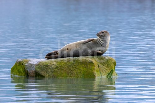 Common seal / harbour seal (Phoca vitulina) resting on rock in the Arctic Ocean along the coast of Svalbard / Spitsbergen in summer, Norway