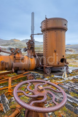 Steam engine at abandoned marble quarry Camp Mansfield / Ny London near Ny-Alesund, Blomstrandhalvøya, Kongsfjorden, Svalbard / Spitsbergen, Norway