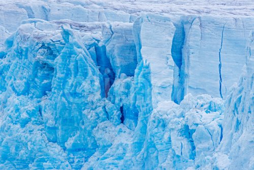 Calving glacier wall showing crevasses, deep cracks in blue ice, Lilliehöök Fjord, Krossfjorden in Albert I Land, Spitsbergen, Svalbard