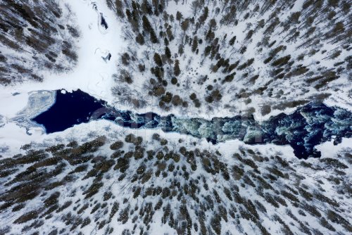 Aerial view over rapids in the river Kitkajoki in winter, Oulanka National Park, Northern Ostrobothnia / Norra Österbotten, Finland