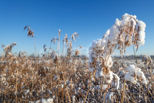 Common reed (Phragmites australis) close-up of panicles / seed heads laden with fresh snow in reedbed / reed bed at wetland in winter