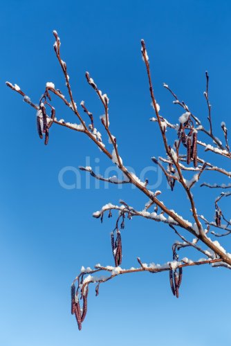 Common alder / European black alder (Alnus glutinosa) close-up of male catkins laden with fresh snow at wetland in winter