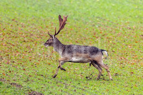 European fallow deer (Dama dama) buck / male running over field / farmland in autumn / fall
