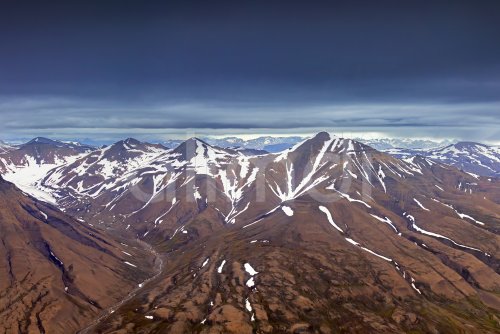 Aerial view over Adventdalen in summer, 30-kilometre valley and river Adventdalselva on the island Spitsbergen in Svalbard, Norway