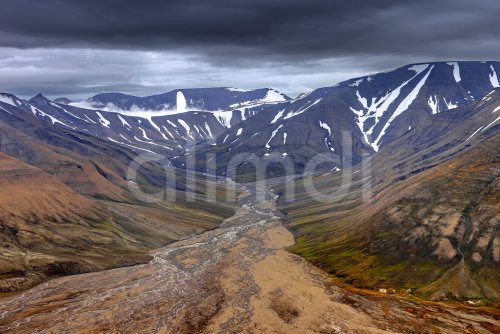 Aerial view over Adventdalen in summer, 30-kilometre valley and river Adventdalselva on the island Spitsbergen in Svalbard, Norway
