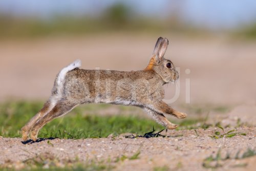 European rabbit / common rabbit (Oryctolagus cuniculus) running in the dunes at dawn in spring