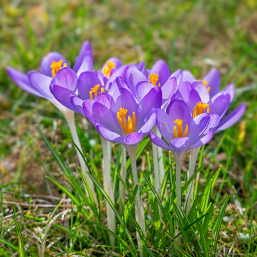 Woodland crocuses / early crocus / Tommasini's crocuses / tommies (Crocus tommasinianus) in flower in garden in winter