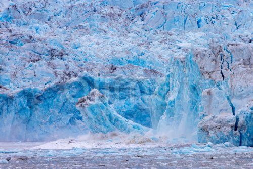 Ice chunk breaking from edge of calving Kongsbreen, marine-terminating glacier debouching into Kongsfjorden in summer, Svalbard / Spitsbergen, Norway