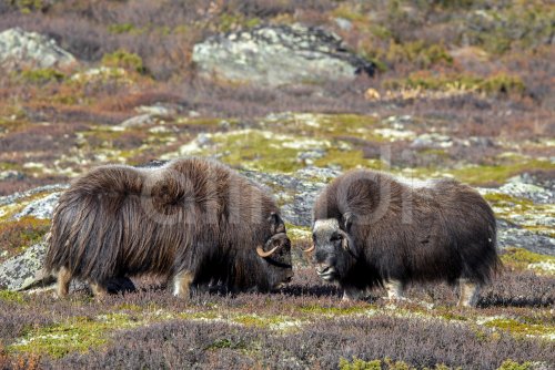 Muskox (Ovibos moschatus) bull and cow on the tundra during the rut / rutting season in autumn / fall, Dovrefjell–Sunndalsfjella National Park, Norway
