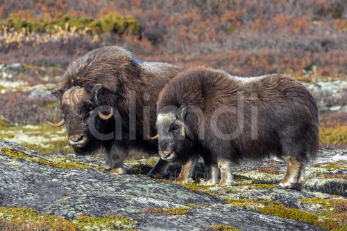 Muskox (Ovibos moschatus) bull and cow on the tundra during the rut / rutting season in autumn / fall, Dovrefjell–Sunndalsfjella National Park, Norway