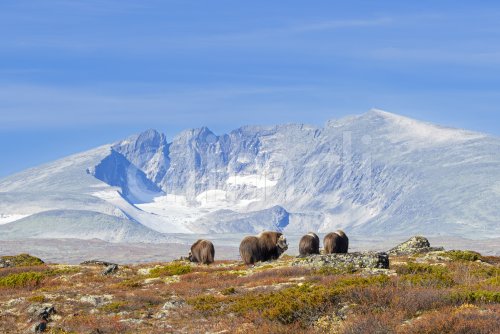 Herd of muskoxen (Ovibos moschatus) foraging on the tundra in front of mountains in autumn / fall, Dovrefjell–Sunndalsfjella National Park, Norway