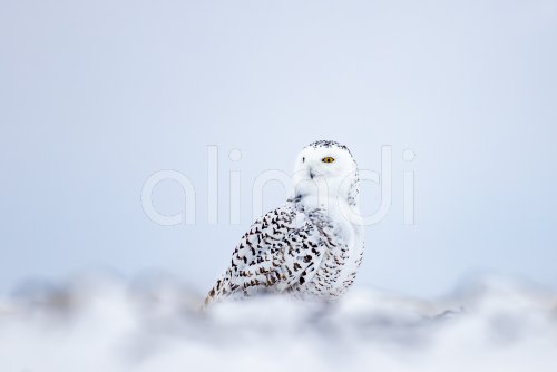 Snowy owl / polar owl / white owl / Arctic owl (Bubo scandiacus / Strix nyctea / Strix scandiaca) adult female on snow covered tundra in winter