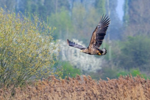 Young white-tailed eagle / Eurasian sea eagle / erne (Haliaeetus albicilla) immature flying over reed bed / reedbed in wetland in spring