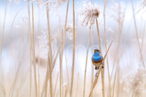 White-spotted bluethroat (Luscinia svecica cyanecula) male perched on reed stem in reedbed and calling / singing in spring