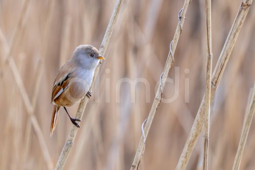 Bearded reedling / bearded tit (Panurus biarmicus) adult female in reedbed perched on reed stem at wetland in spring
