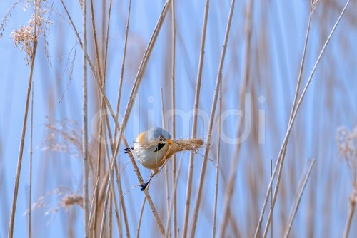 Bearded reedling / bearded tit (Panurus biarmicus) male collecting seed heads in beak as nesting material for nest building in reed bed in spring