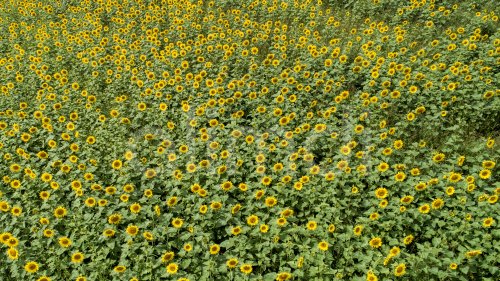 Aerial view of a field of sunflowers (Helianthus annuus) at the edge of a forest near Augsburg, Bavaria, Germany, Europe