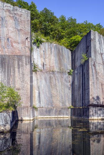 Abandoned red marble quarry Carrière de Beauchâteau at Senzeilles, Cerfontaine, province of Namur, Belgian Ardennes, Wallonia, Belgium