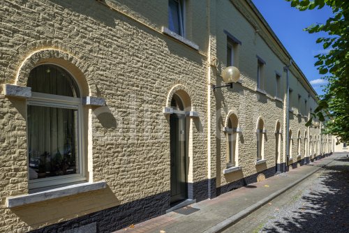 Yellow workers' townhouses / row houses in working-class quarter Bois-du-Luc, coal mine in Houdeng-Aimeries, La Louvière, Hainaut, Wallonia, Belgium