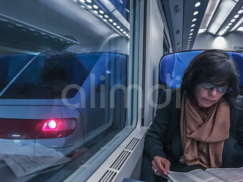 Woman Travel in a Train and Reading a Newspaper in Monte Carlo, Cote d? azur, Monaco.