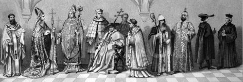 Cultural history of religion, from left: priest of old Byzantium, bishop in a pluvial, bishop in vestment, provost, cardinal deacon, diocesan priest, Armenian bishop, the Russian Patriarch Nikon, Italian Abbate, a Protestant minister, historical illustration