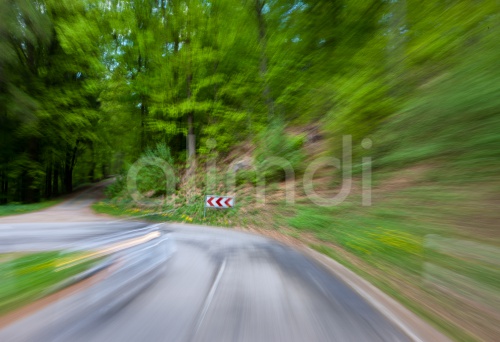 High speed motion, country road in a wooded area with a sharp left turn, Germany, Europe, PublicGround