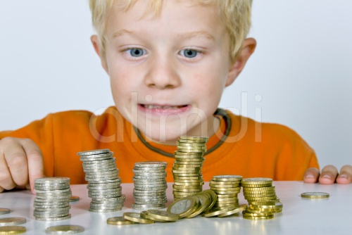 Boy, 5-years old, playing with euro coins, symbolic picture for price drop