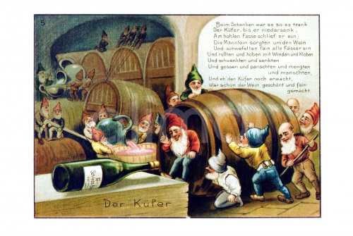 Historical illustration, Heinzelmaennchen, little house gnomes from Cologne, Image 5 of 9, Der Kuefer, The Cellarman, 19th Century legend, poem by August Kopisch