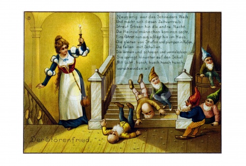Historical illustration, Heinzelmaennchen, little house gnomes from Cologne, Image 8 of 9, Der Stoerenfried, The Troublemaker, 19th Century legend, poem by August Kopisch