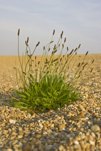 Ribwort Plantain (Plantago lanceolata), flowering, growing on shingle beach, Abbotsbury, Dorset, England, United Kingdom, Europe