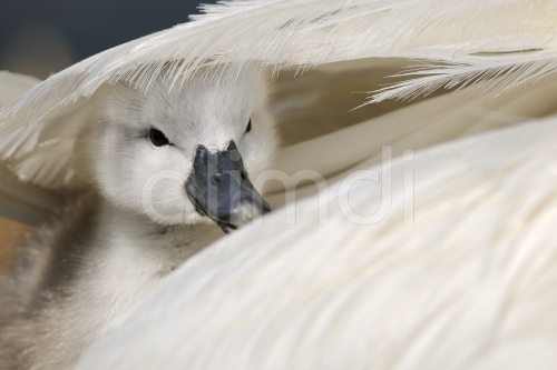 Mute Swan (Cygnus olor), cygnet, under wing of adult female, Abbotsbury, Dorset, England, United Kingdom, Europe