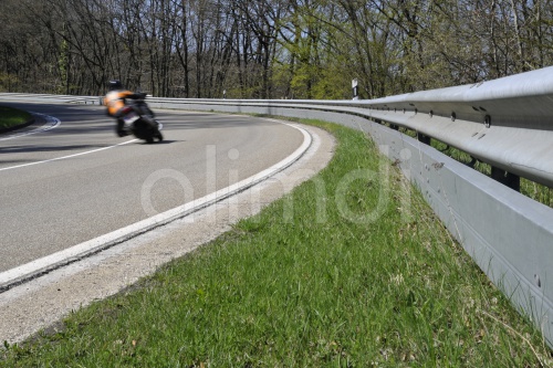 Motorcyclist in a curve on a country road with guard rail for protection, Eifel, Germany, Europe