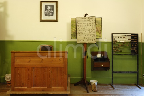Teacher's desk with script table and abacus, portrait of Prince Regent Luitpolt, classroom from 1910, Museum for Industrial Culture, Aeussere Sulzbacher Strasse 60-62, Nuremberg, Middle Franconia, Bavaria, Germany, Europe