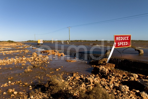 Sign, reduce speed, Damaged road during a flood, Western Australia