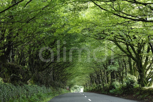 "Tree tunnel" parkway with beeches on a country road, Milton Abbot, Devon, England, United Kingdom, Europe