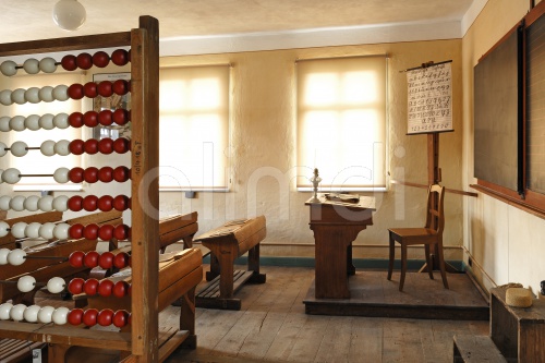 Classroom with teacher's desk and ABC board, on the left an abacus, 1935, school building from Pfaffenhofen, built in 1801, Franconian open-air museum, Eisweiherweg 1, Bad Windheim, Middle Franconia, Bavaria, Germany, Europe