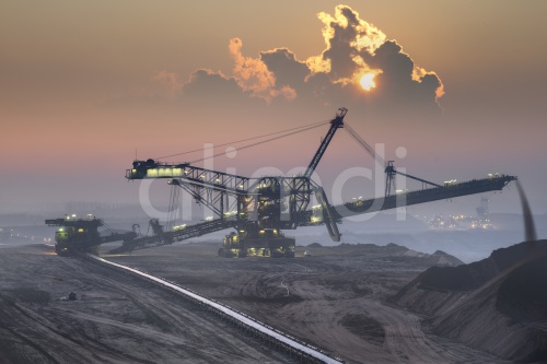 Spreaders in an open-cast lignite mine in the early morning, Garzweiler, North Rhine-Westphalia, Germany, Europe