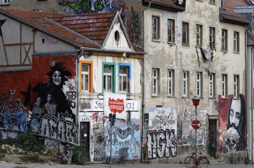 Condemned buildings in the historic district, painted with graffiti and an anti-Nazi slogan, alternative scene, Weimar, Thuringia, Germany, Europe