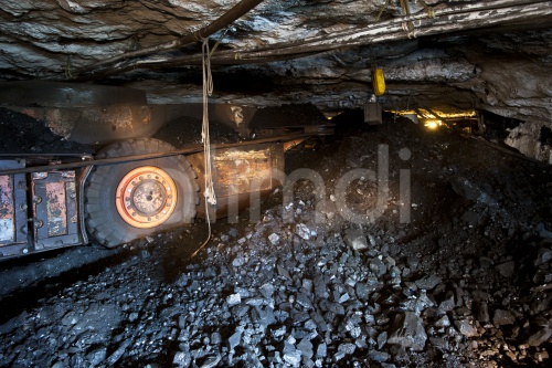 Underground coal mining, transportation of coal to the conveyor belt, Gruve 7, Store Norske Kullkompaniet mine, Longyearbyen, Spitsbergen, Svalbard, Norway, Europe