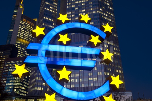 Euro symbol in front of the ECB building, European Central Bank, at night, Frankfurt am Main, Hesse, Germany, Europe