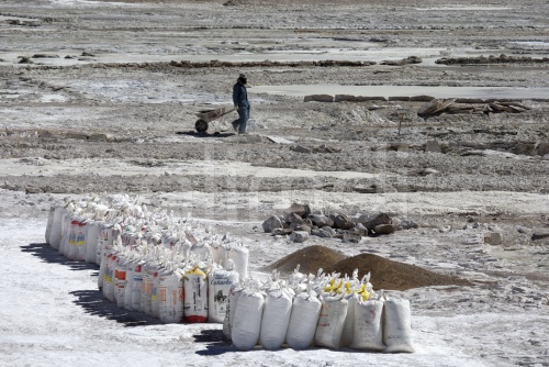 Salt worker with a wheelbarrow, flour sacks packed with salt at a salt lake, Alti Plano, Potosi, southern Bolivia, South America