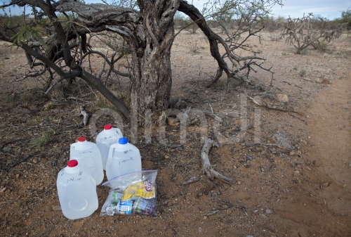 Water and food for Mexican migrants left along a desert trail by volunteers with No More Deaths, a faith-based group with the goal is to reduce the death toll among migrants who cross the desert to find work in the United States; more than 5, 000 have died since 1998, Arivaca Junction, Arizona, USA