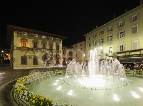Rosmini Fountain, Cassa di Risparmio di Trento e Rovereto building at the back, Piazza Rosmini square, Rovereto, Val d'Adige valley, Trentino-Alto Adige, Italy, Europe