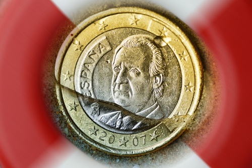 Spanish one-euro coin sinking into water, symbolic image for the debt crisis in Spain