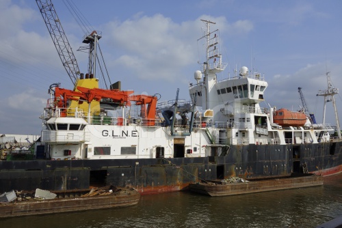 Old ship being dismantled to recycle scrap metal at Van Heyghen Recycling export terminal, port of Ghent, East Flanders, Belgium