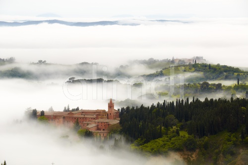 Monte Oliveto Maggiore abbey with mist-shrouded valleys, Chiusure, Tuscany, Italy