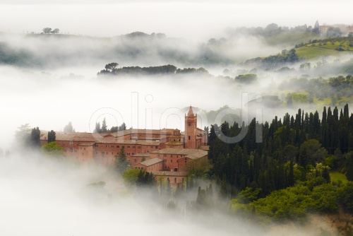 Monte Oliveto Maggiore abbey with mist-shrouded valleys, Chiusure, Tuscany, Italy