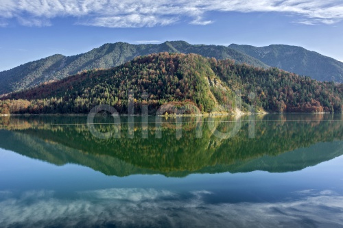 Isar river dammed at Sylvenstein Dam, Isar Valley at Isarwinkel, Upper Bavaria, Bavaria, Germany
