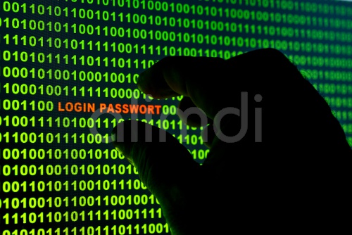 Hand reaching for the words ""Login Passwort"" in a binary code