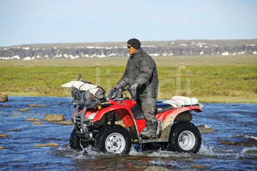 Man of the Inuit people riding a quad bike, ATV, through a river in the tundra on Victoria Island, formerly Holman Island, village of Ulukhaktok, Northwest Territories, Canada